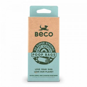 Sáčky na exkrementy BecoBags s peprmintovou aroma jsou velké, silné a nepropustné, se svěží vůní máty na maskování nepříjemných pachů. Mají velikost 22,5 x 33 cm, jsou extra dlouhé a pevné aby ochránili vaše ruce. Materiál je hrubý a švy pevné, takže víte, že se na ně můžete kdykoliv spolehnout a vejdou se do většiny pouzder na sáčky. Na jejich výrobu bylo použito až 40% recyklovaného materiálu, čehož výsledkem je menší dopad na životní prostředí než při výrobě nového plastu. Rolka kolem které jsou namotané sáčky je vyrobena z recyklovaného kartonu a totéž platí pro jejich kartónové balení. Sáčky jsou dostatečně tlusté a vejdou se do většiny standardních pouzder na sáčky.